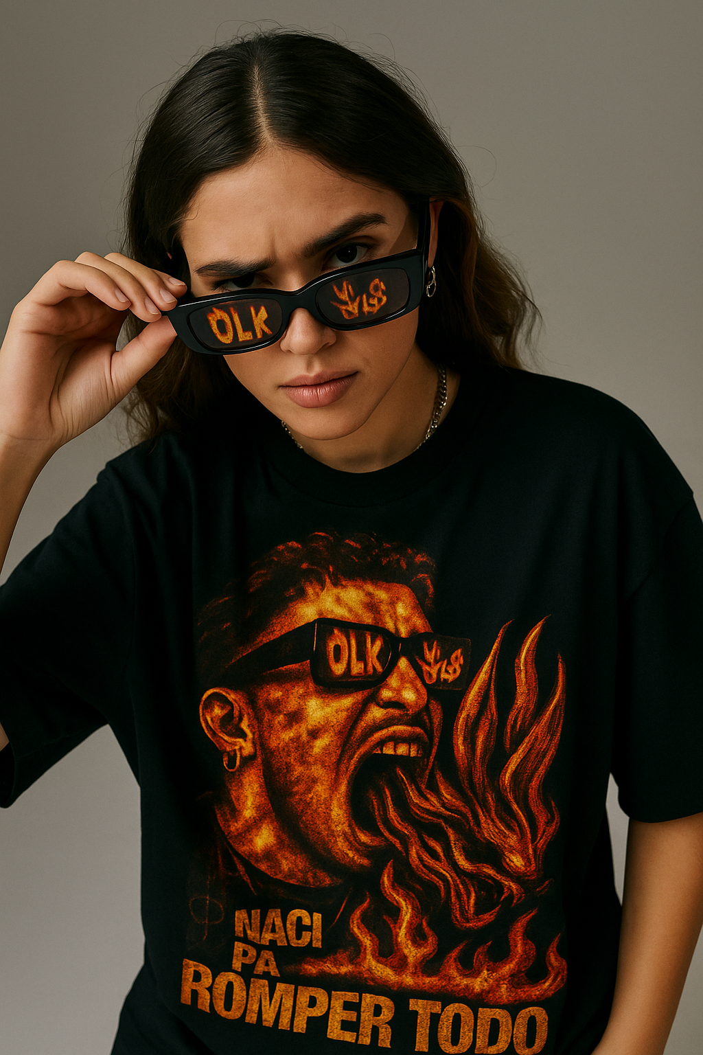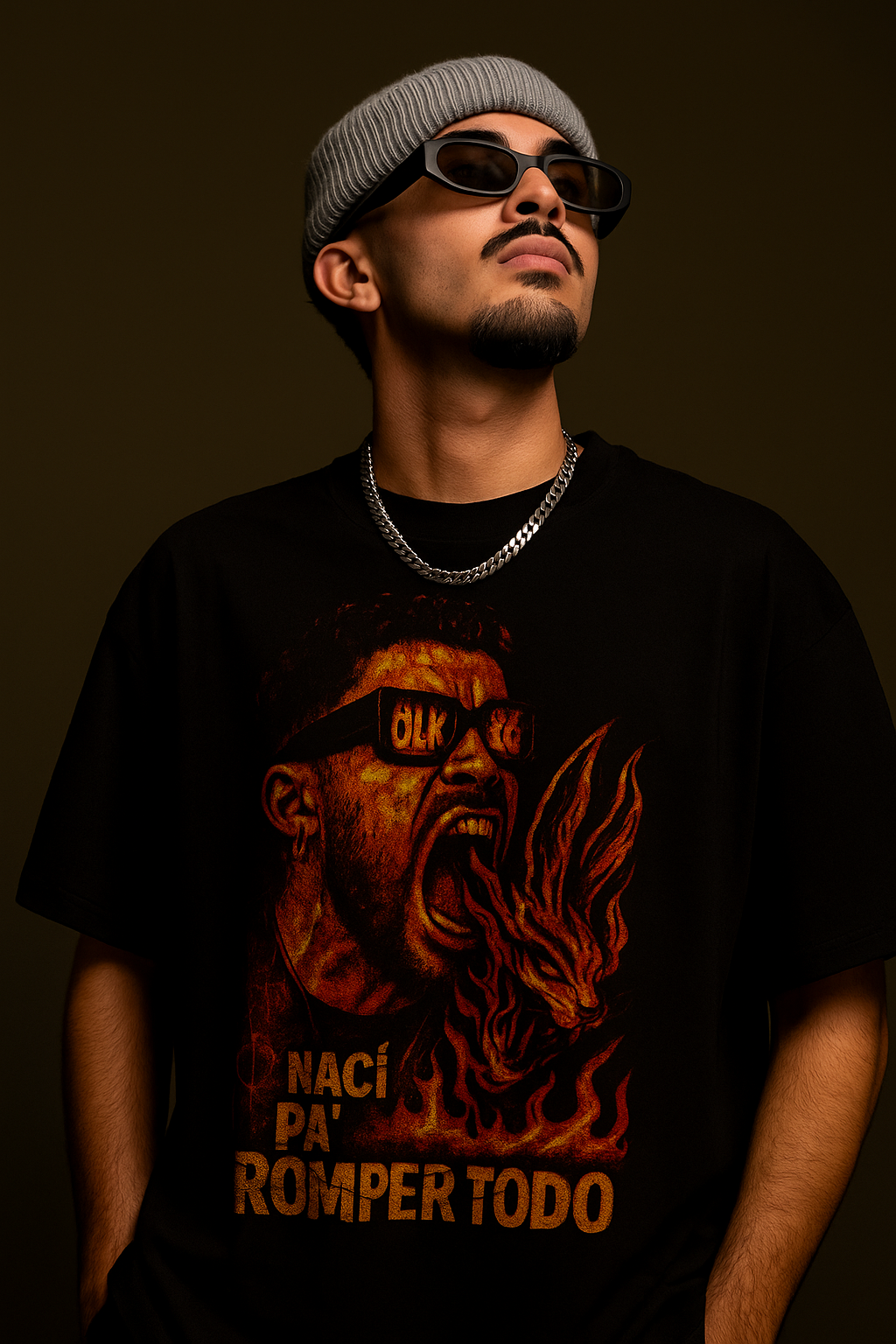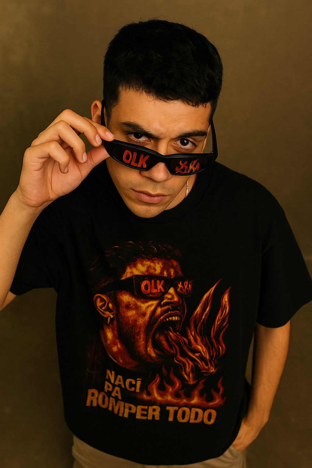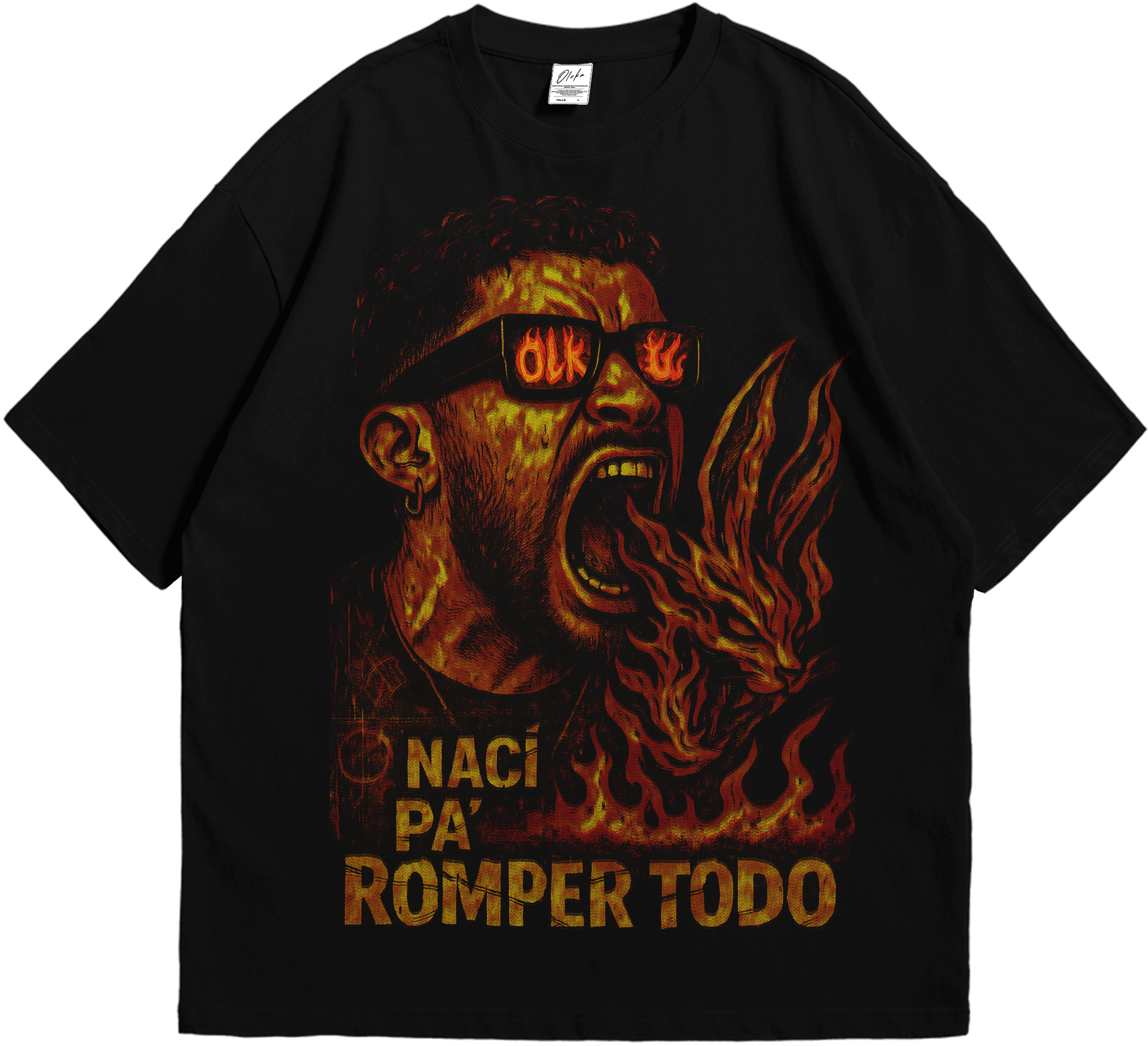 🔥 Diseño central: Benito escupiendo fuego, gafas OLK, energía cruda