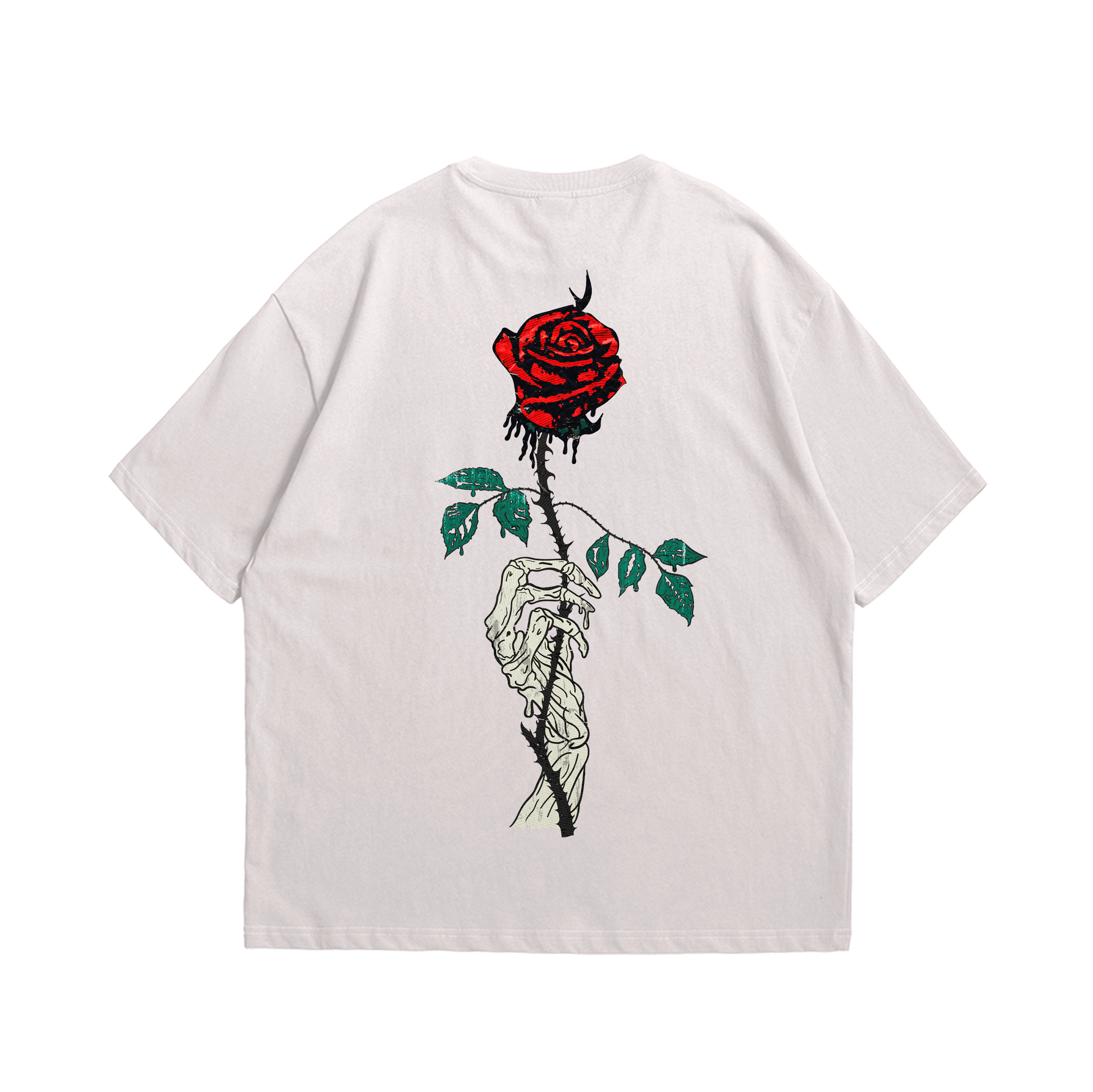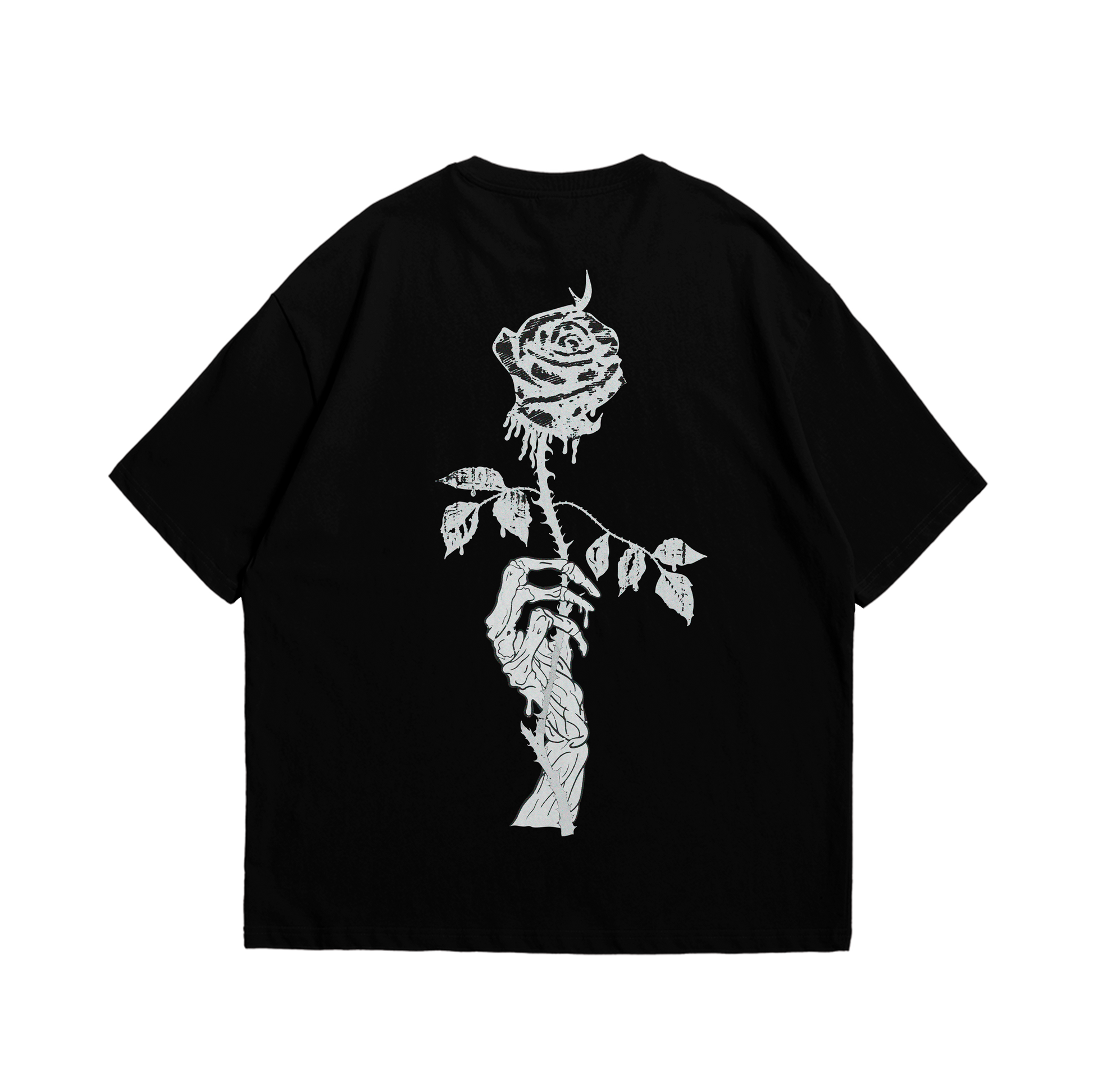 Esta remera no es solo una prenda; es un símbolo de que incluso en lo aparentemente frágil, hay belleza y fortaleza. "LA BELLEZA EN LA RESISTENCIA" captura la esencia de abrazar lo efímero y transformar el dolor en poder. En su espalda, una rosa con espinas, sostenida por una mano de huesos, representa la dualidad de la vida: la delicadeza que persiste entre las adversidades y la tenacidad que nos define.